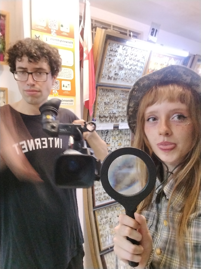 A person with dark curly hair and glasses holds a video camera. The person wears a black shirt with the word "INTERNET" printed on it. Standing next to them is a young woman with blonde hair and bangs, wearing a bucket hat and plaid shirt. She holds a magnifying glass. Behind them is a wall filled with framed displays of butterflies. A poster and a flag are also visible in the background. The woman is sticking her tongue out slightly.