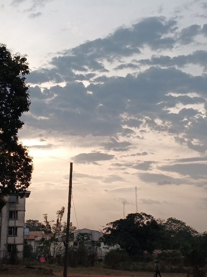 This image presents an outdoor scene in Nsukka, Nigeria, under an overcast sky during low sun conditions