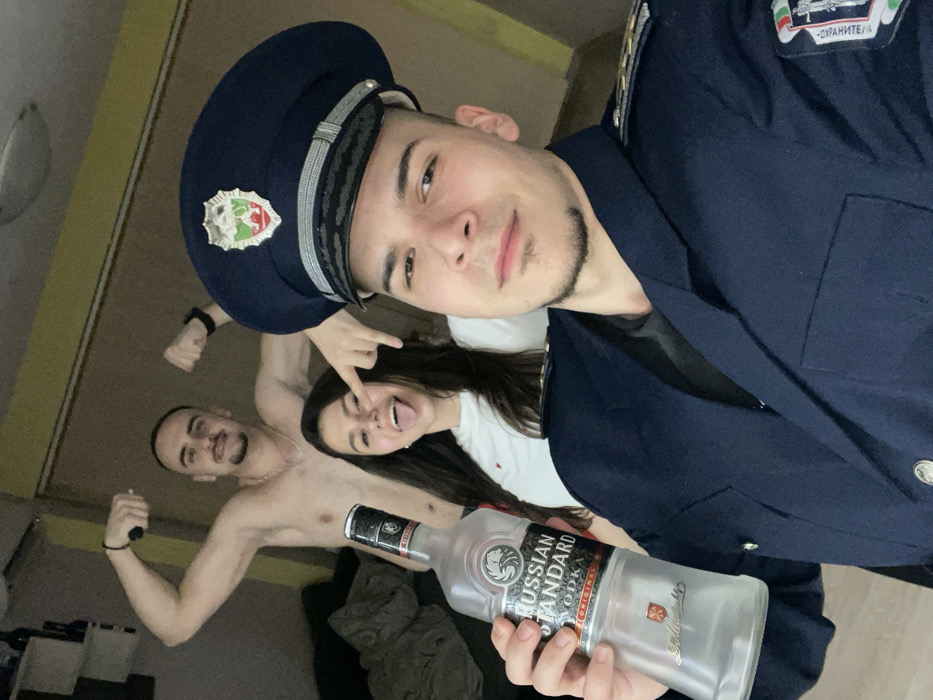 This image depicts three young adults posing indoors in what appears to be a residential room, located in the city of Burgas, Bulgaria. In the foreground, centered and slightly to the right, a male individual with short dark hair and a goatee is visible. He is wearing a dark blue uniform jacket with epaulets on the shoulders, indicating rank or service, and a matching peaked cap. The cap features a Bulgarian coat of arms emblem and the word 'БЪЛГАРИЯ' (Bulgaria) on its front. A patch on the jacket's left sleeve displays the Bulgarian flag colors and the word 'ОХРАНИТЕЛ' (Security Guard/Bodyguard). He holds an almost empty, clear glass bottle of "RUSSIAN STANDARD VODKA ORIGINAL" in his left hand, presenting it towards the camera. His gaze is directed at the camera with a neutral expression. Behind this individual, positioned in the middle, is a female with long dark hair, wearing a white t-shirt. She is sticking out her tongue and pointing her right index finger towards her right eye, looking directly at the camera. Further in the background, to the left, a shirtless male individual with dark hair and a necklace is flexing both biceps, looking towards the camera with a slight smile. The environment consists of light-colored walls, possibly beige or yellow. A dark-colored sofa or similar furniture item is partially visible on the left side of the background. The lighting in the room appears to be artificial.