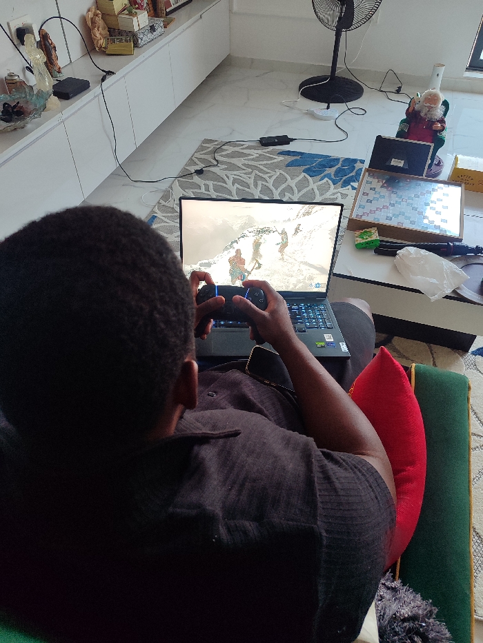 In the city of Unknown, Unknown, an individual is observed from behind, seated in a green upholstered chair with a red cushion, actively engaged with a laptop computer. The person, wearing a dark short-sleeved shirt and having short dark hair, is operating a black gaming controller with illuminated buttons. A smartphone is partially visible on their lap. The laptop screen displays a video game scene featuring multiple figures in a snowy or icy environment. To the right of the individual, a white rectangular table holds a wooden Scrabble board with tiles, a red and white Santa Claus figurine in a green chair, a white plastic bag, and a green object. Behind this table, a black oscillating fan stands on the light-colored tiled floor, which is partially covered by a grey and blue patterned rug. In the background, a long white cabinet unit is mounted on the wall. On its surface, various items are displayed, including a clear figurine, a blue glass bowl, and several stacked boxes. Multiple electrical cables are visible throughout the scene, connecting to various devices and wall outlets.