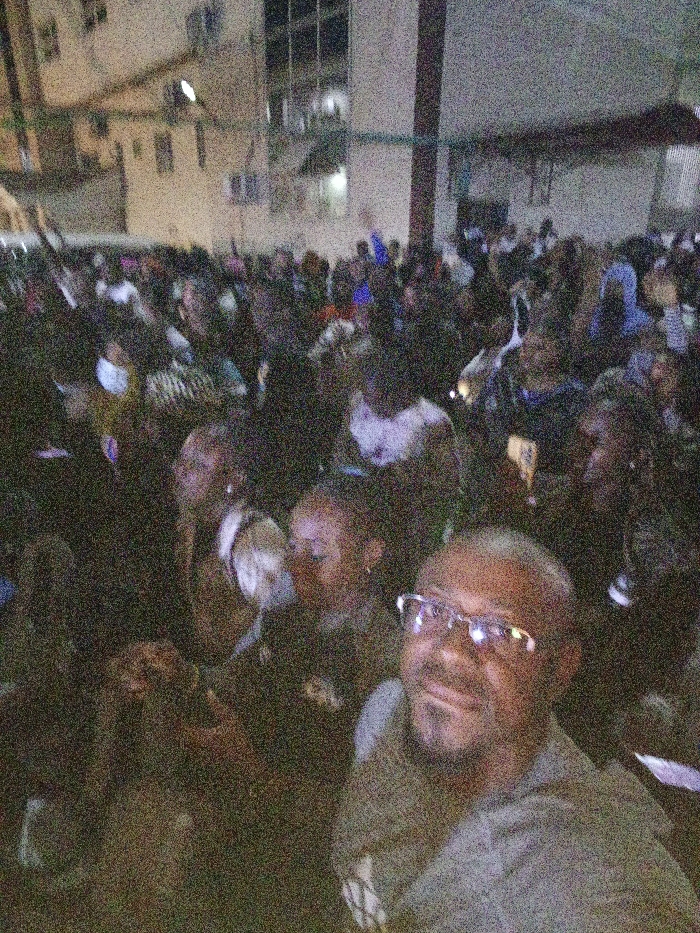 A large crowd gathers outside a building at night. Many people hold up phones, possibly recording the event. The crowd is densely packed, and the individuals are diverse. In the foreground, a man with glasses and a slight beard is facing the camera, possibly taking a selfie. The overall image has a grainy, low-light quality, obscuring details.