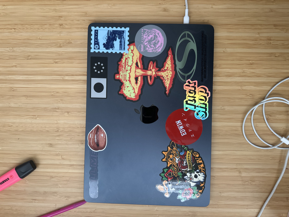 The scene depicts a top-down view of a dark grey Apple MacBook laptop resting on a light brown wooden surface with horizontal grain, identified as being in Wealden, United Kingdom. The laptop's lid is adorned with multiple stickers: * In the upper left, a partially visible white sticker reads "CALL ME," adjacent to a sticker depicting glossy, open red lips. * Central top, two black rectangular stickers are present: one with a white circle (reminiscent of the Japanese flag), and the other with seven white stars arranged in a circle. * In the upper right, a blue sticker styled as a postage stamp features an image of Mount Fuji above trees and Japanese text, likely "EDWIN." * Prominently placed in the mid-right is a large red and yellow sticker illustrating an atomic bomb mushroom cloud. Below this is a smaller, clear circular sticker with a pink swirling design and the word "COACH." * The bottom left features a complex, multi-colored sticker with a skull, roses, a heart pierced by a dagger, and text including "Ed Hardy," "UNKNOWN," and "GANG." * Centered bottom, a circular red sticker displays "EDWIN" in both English and Japanese Katakana. * Adjacent to the red "EDWIN" sticker is a holographic sticker spelling "Tuck Shop." * In the bottom right, an oval-shaped dark green/black sticker contains a stylized 'S' and smaller, partially legible text "SATISFACTION GUARANTEED." A white braided cable is connected to the right side of the laptop, with its coiled portion resting on the wooden surface in the bottom center. In the upper left area of the wooden surface, a pink Stabilo brand highlighter pen with a black cap is positioned diagonally, pointing towards the lower right. A pink-tipped pen or pencil is partially visible extending from the left edge of the frame, below the highlighter. No individuals are present in the image.