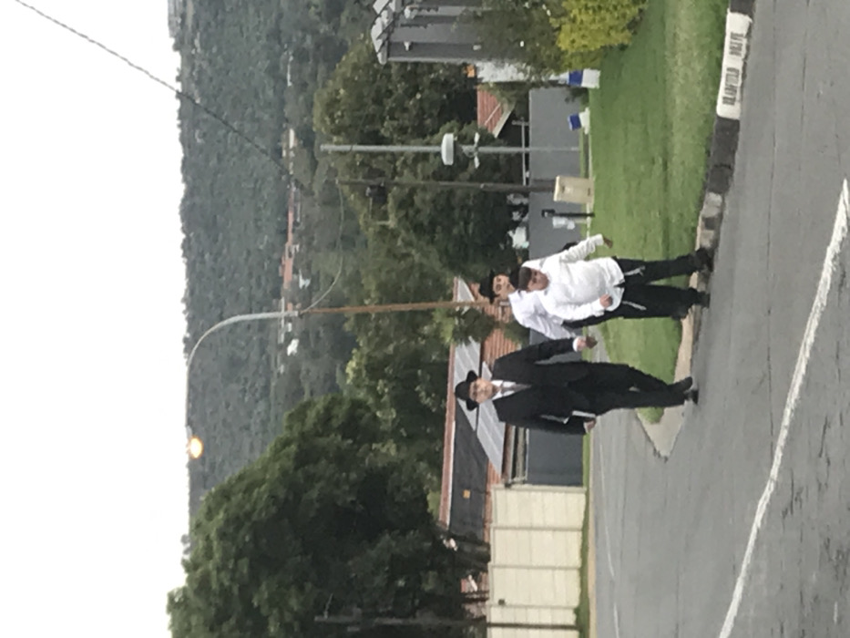 Three men in traditional clothing walk down a street. The man in the front wears a black suit and hat. Behind him are two men wearing white shirts and black pants. They walk along the edge of a curb, with a grassy area next to the road. Behind them are trees and buildings. In the background is a hill covered in trees.