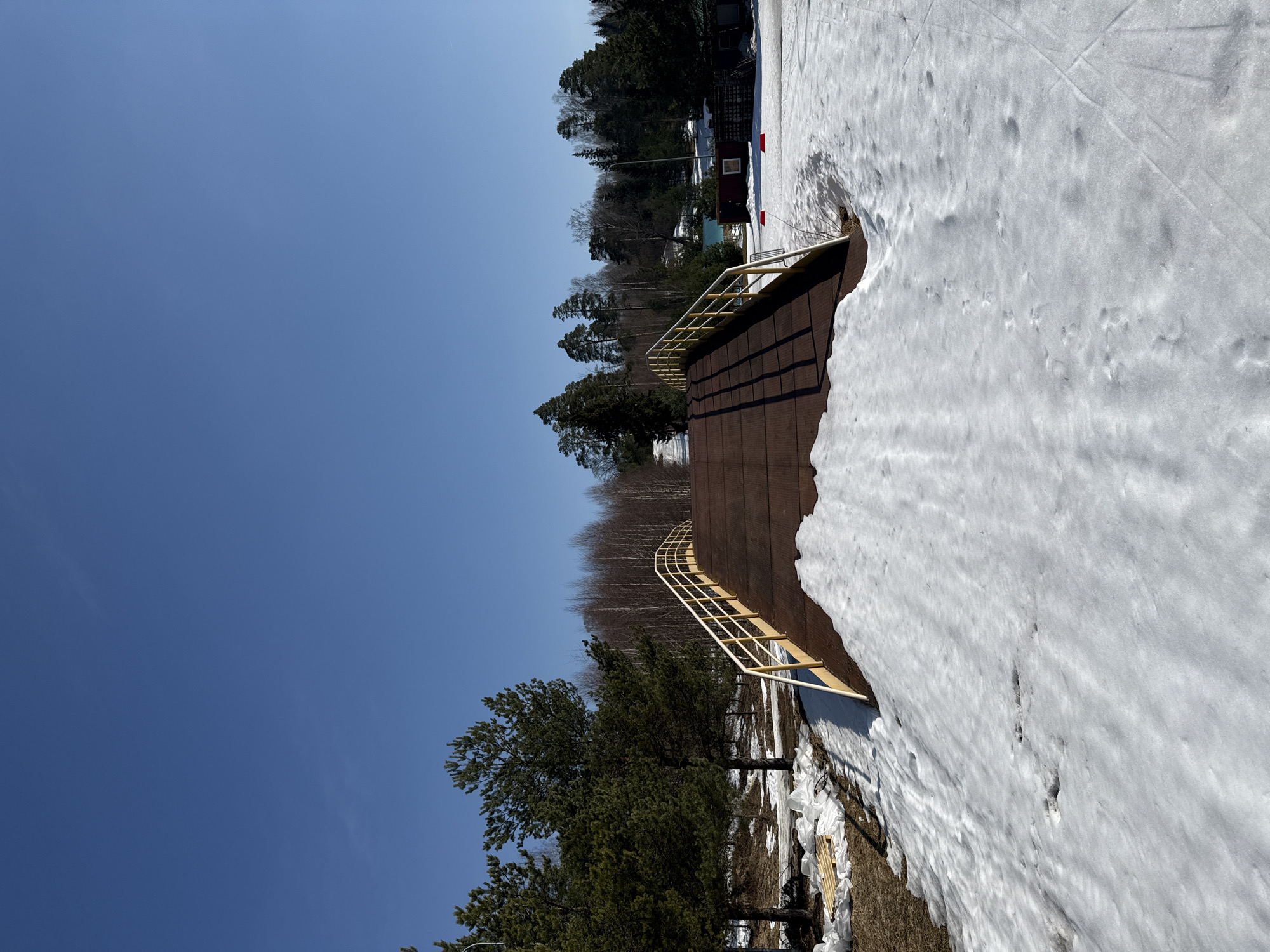 An image captured in Oleshkovo, Russia, depicts an outdoor scene dominated by a brown, corrugated metal pedestrian bridge or ramp extending from the foreground into the background, curving slightly upward. Yellow metal handrails line both sides of the bridge. The foreground and areas immediately adjacent to the bridge are covered in partially melted snow, revealing patches of brown earth and dry grass. Footprints are discernible in the snow to the left and right of the bridge. To the left of the bridge's base, a stack of wooden pallets rests on exposed ground next to white plastic sheeting. The sky is clear and bright blue, occupying the upper half of the frame. Tall pine trees with dark green needles stand to the left of the bridge, while a line of bare deciduous trees stretches across the mid-ground. In the distance to the right, behind the bridge, several small structures are visible, including a red-brown building with a window and a dark container-like structure, interspersed among more trees. No individuals or active subjects are present in the scene.