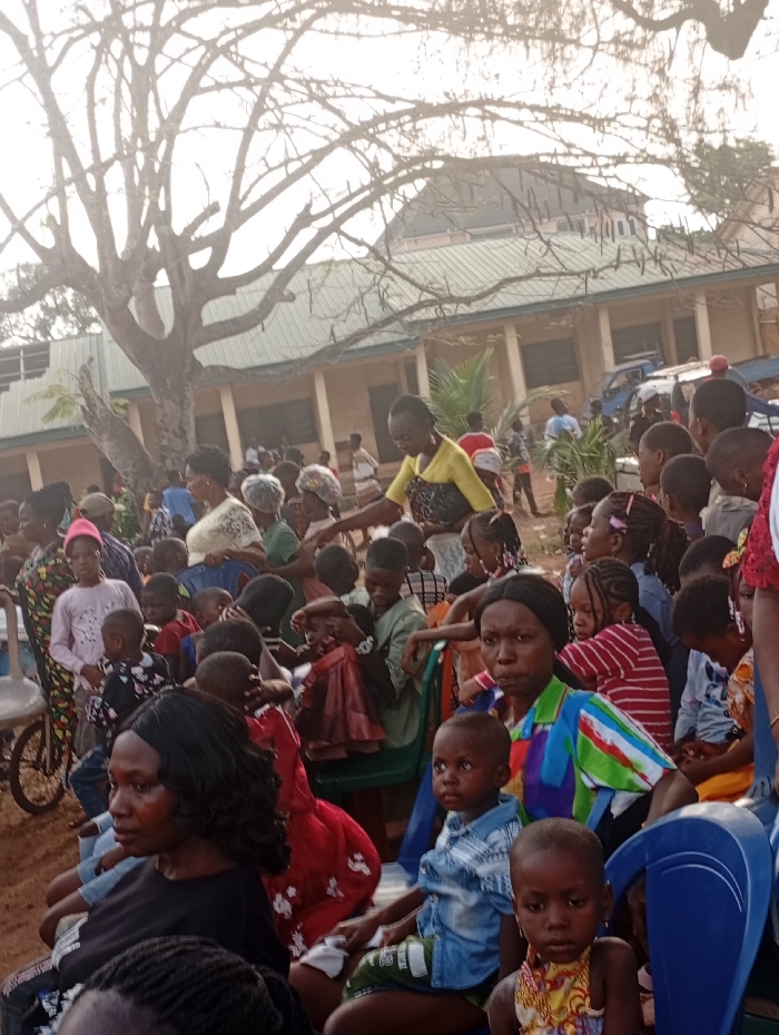 This image depicts a large gathering of individuals, predominantly Black adults and numerous children, in an outdoor setting within the city of Nkwelle, Nigeria