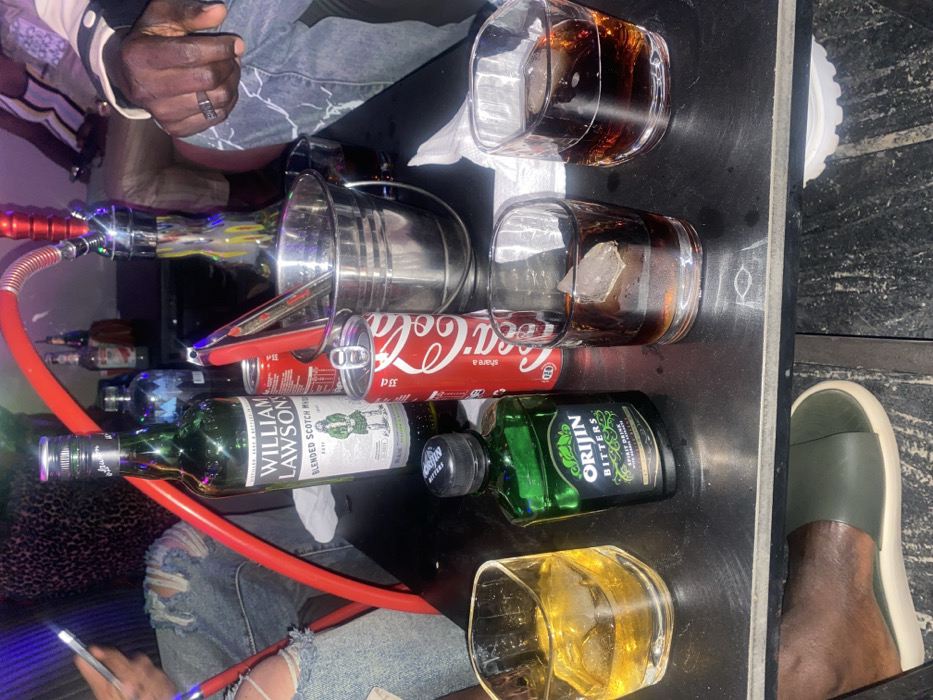 A table features several drinks and refreshments. There are three glasses, two containing dark liquids with ice and one filled with a lighter, amber-colored liquid with ice. Next to the glasses is a can of Coca-Cola, a bottle of William Lawson's Blended Scotch Whisky, and a bottle of Orijin Bitters. An ice bucket sits on the table, along with parts of a hookah, suggesting a relaxed social setting. A person's hand wearing a ring and a foot in a slide are also visible.