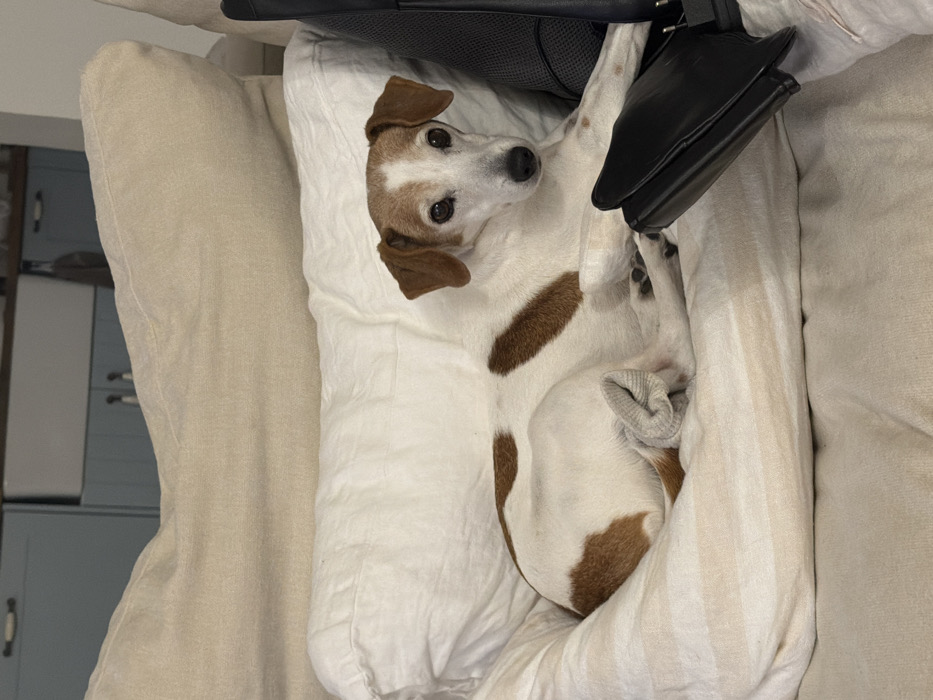 - "A Jack Russell Terrier is curled up on a light-colored sofa" by FM-u366Z2, licensed under CC BY 4.0