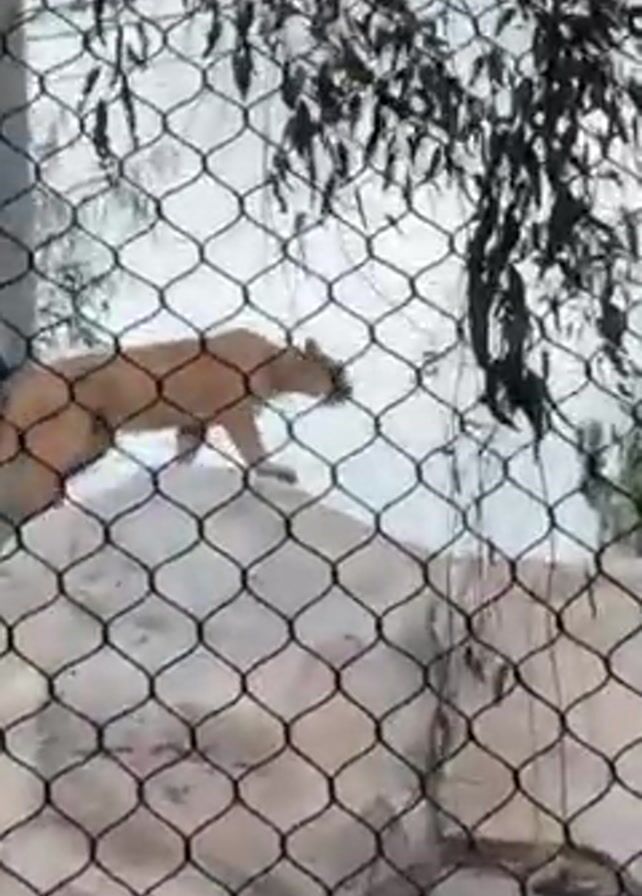 tan mountain lion walking on a rock formation in a zoo enclosure. The scene is viewed through a wire mesh fence, with tree branches and leaves obscuring the view at the top of the frame. The mountain lion walks from left to right across the top of the rock, then descends on the right side of the frame, disappearing from view.