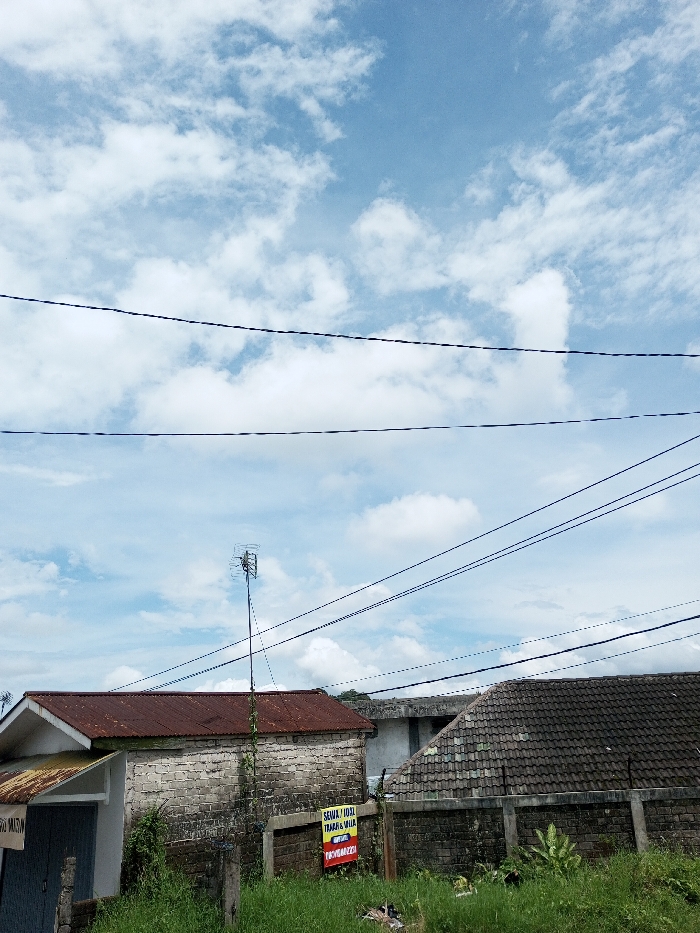 partly cloudy sky with multiple power lines running across it. Below, there are a few buildings with aged roofs and walls, separated by a low concrete fence. Green overgrowth is visible along the bottom edge of the frame. There is a tall television antenna extending above one of the buildings. A small sign is attached to the fence.