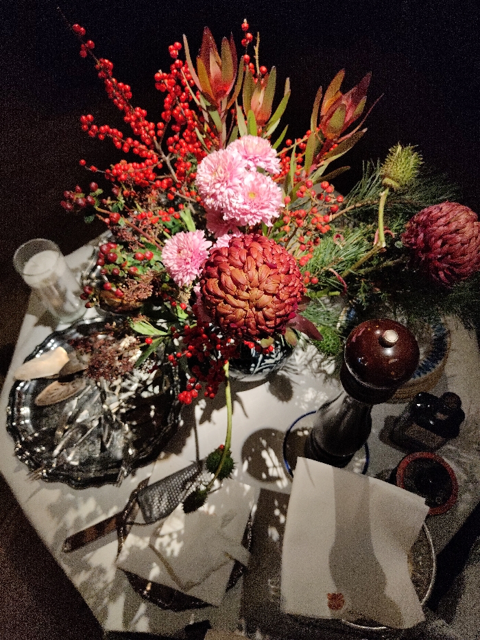 The scene depicts a static, overhead view of a dining table setting in Saint Petersburg, Russia, likely within a restaurant or private dining area characterized by dim lighting. No individuals are present. At the center of the white-clothed table is a large, elaborate floral centerpiece in a dark, patterned vase. The arrangement features a prominent, large reddish-brown chrysanthemum-like flower, flanked by several smaller, fluffy light pink chrysanthemums. It is heavily interspersed with bright red berries, dark green evergreen foliage (resembling pine or cedar), and several reddish-brown protea-like blooms and spiky, green-brown seed pods. To the left of the centerpiece, a silver-colored, ornate platter with scalloped edges holds a dark, textured food item, possibly a pâté or spread, accompanied by a small, light-colored wooden serving utensil. A tall, clear glass stands to the upper left of this platter. Below the platter, various pieces of silver-colored cutlery, including a serrated knife with a dark handle, are arranged on the tablecloth. A folded white napkin is situated in the lower-left corner. To the right of the centerpiece, a tall, dark brown wooden pepper mill with a lighter top stands upright. Adjacent to it are a small dark bowl containing olives and another small, reddish-rimmed bowl, possibly for salt or spices. A second folded white napkin, featuring a small reddish emblem, is positioned below the pepper mill. A blue-rimmed coaster or plate is visible beneath the pepper mill's base. The table surface is illuminated, revealing distinct dappled shadows suggestive of foliage from an overhead light source. The background is uniformly dark.