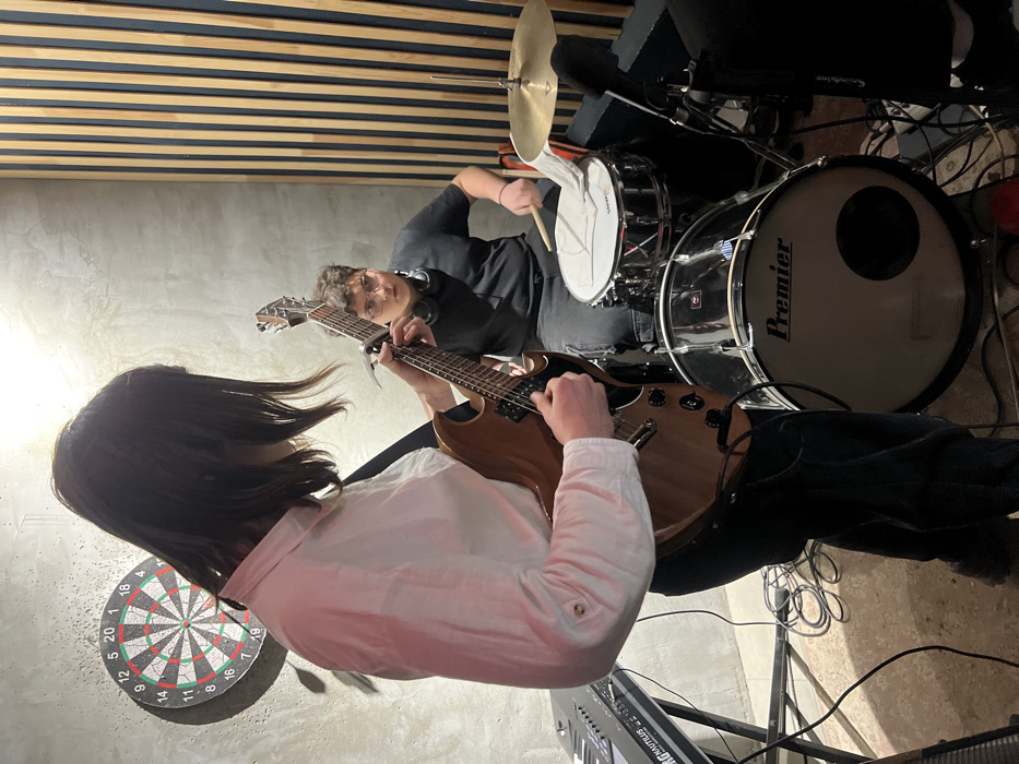 The scene captures two individuals engaged in a musical rehearsal within an indoor studio environment in the city of Ovoshchnoy, Russia