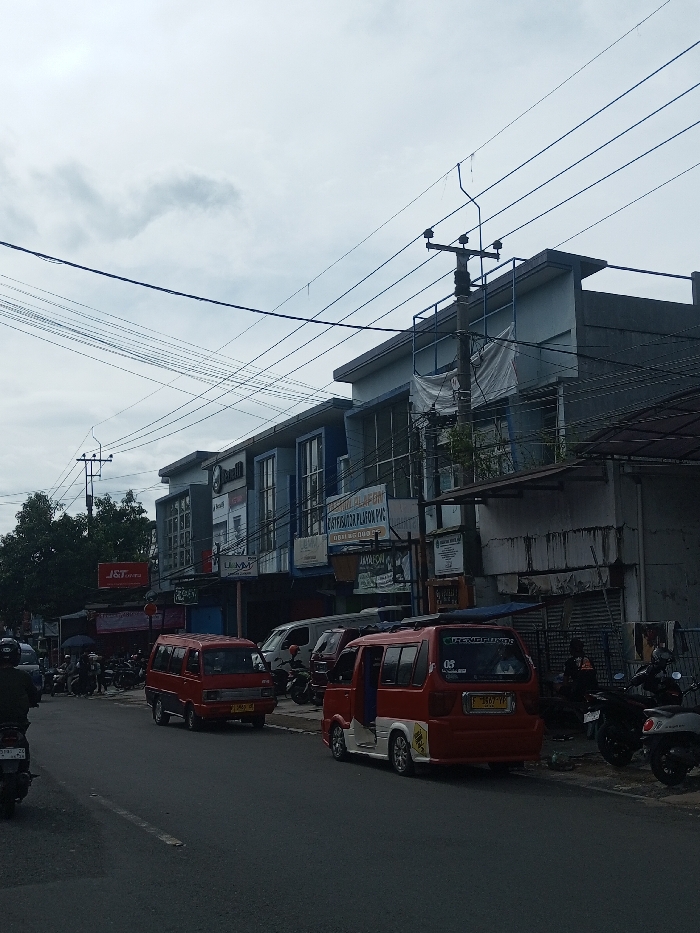 A street scene shows two red vans parked on the right side of the road. A third red van is further down the road to the left. Motorcycles are parked along the sidewalk to the right, and more are visible further down the street. Two-story buildings line the street, with signs indicating businesses. Electrical lines crisscross the sky above. The sky is overcast and gray.