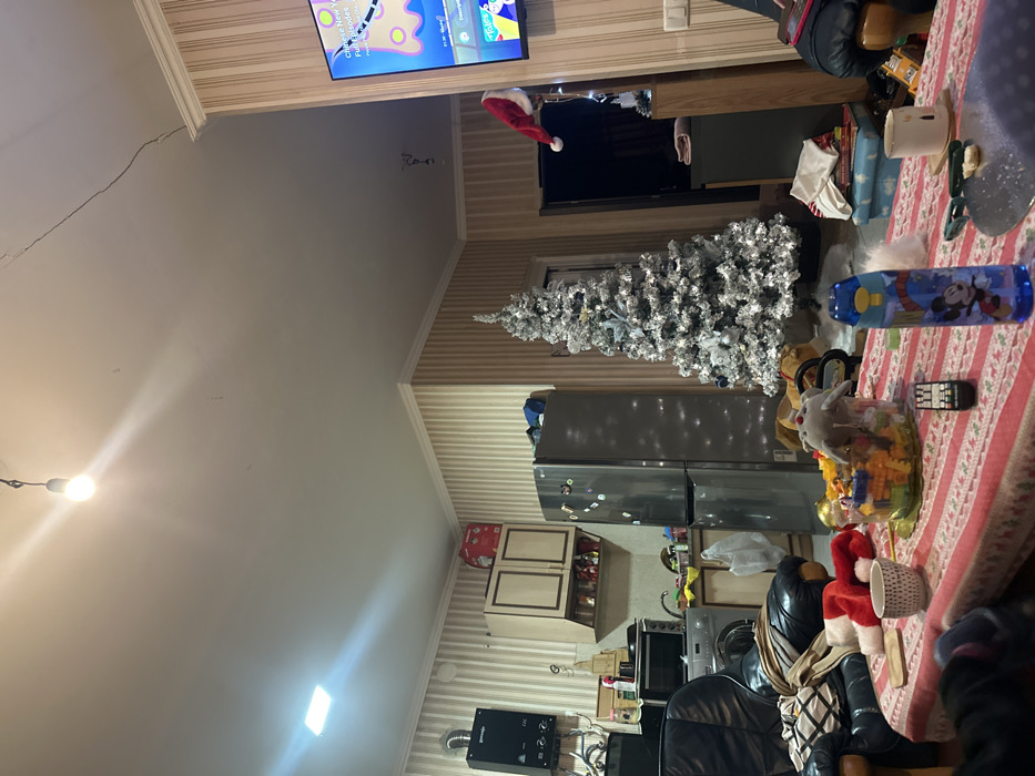 An interior shot reveals a living space with a Christmas tree, a television showing a cartoon, and a striped wallpaper backdrop. A Santa hat sits atop a shelf, while a silver refrigerator stands nearby. A table laden with various items dominates the foreground, featuring a water bottle, toys, and a mug. The room is brightly lit, highlighting the presence of a light bulb on the left and a rectangular light fixture on the wall. A gas boiler is visible at the bottom, near a kitchen area.