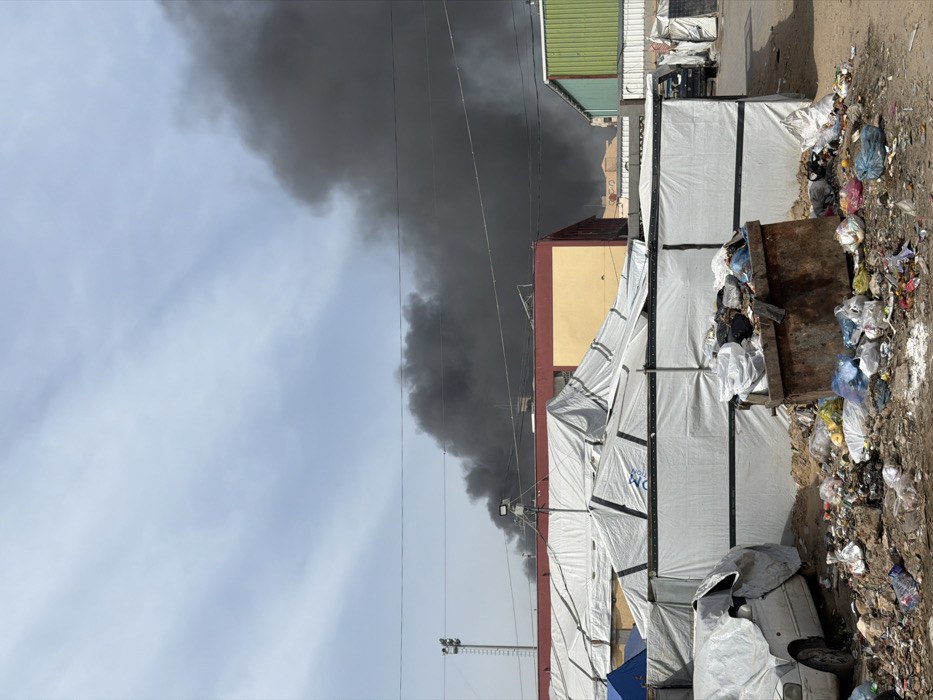 The image captures an outdoor scene in the city of Gaza, Palestinian Territory, under a pale blue sky with light cloud cover. A large, dense plume of black and dark gray smoke rises from the mid-to-background, indicating a significant fire. In the midground, multiple temporary shelters or tents, constructed from white tarpaulins, are visible, some bearing a partial "UN" logo. Behind these tents are several buildings, including one with a red roof and cream-colored walls, and another with green paneling. A white partition or barrier extends horizontally across the scene in front of the tents. Utility poles equipped with floodlights and overhead power lines traverse the upper midground. The unpaved foreground is extensively covered with scattered debris and refuse, comprising plastic bags, bottles, wrappers, and general discarded items. A rusty, open-top metal dumpster sits in the lower center-right, overflowing with trash that also spills onto the ground around it. A white car, partially covered by a white tarp, is parked on the far left of the foreground. No individuals are visible within the frame.