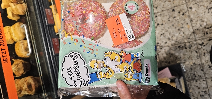 A close-up, eye-level shot in a retail environment, likely a supermarket or bakery, located in Kamenz - Kamjenc, Germany. The primary subject is a clear plastic package of "The Simpsons" branded donuts held by a human left hand. The package features a light teal-green cardboard backing with full-color cartoon illustrations of Homer, Marge, Bart, Lisa, and Maggie Simpson. The "The Simpsons" logo is prominently displayed at the top. The package contains four pink-glazed donuts generously covered with multicolored sprinkles, visible through the transparent plastic. A circular white label on the right indicates "4 Donuts." An orange discount sticker is affixed to the plastic, reading "BIS ZU 30%" (Up to 30%), displaying a price of "1.89," and containing a QR code. Text "Donuts PINK GLAZED" is visible on the lower left of the packaging. In the upper background, out of focus, a glass display case is visible, containing several baked goods resembling bread rolls or pastries. Above this display is a bright orange banner with partial German text "JETZT ZUGREI...", indicative of "JETZT ZUGREIFEN" (Grab it now/Help yourself now). Below the display, small digital price tags are visible, one showing "0.35." The lower background shows a tiled floor with a light gray or beige base and dark speckles.