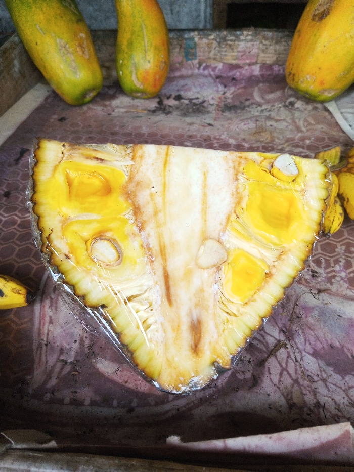 - "A halved jackfruit, wrapped in plastic, dominates the center of the image" by FM-vTEVn2, licensed under CC BY 4.0