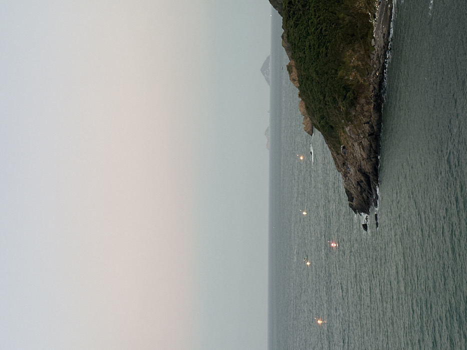 The image depicts a coastal scene in Vĩnh Lương, Vietnam, observed during what appears to be twilight hours (dusk or dawn). The upper portion of the frame shows a pale, light gray-blue sky transitioning to a slightly warmer, hazy hue closer to the horizon. The central and left-hand areas are dominated by a body of water, likely the sea, which is dark grayish-green with discernible surface ripples. Along the right side, a rugged coastline composed of dark rock formations rises, partially covered by dense green vegetation, predominantly bushes and small trees. A small, dark pebble beach is visible at the base of the rocky incline in the lower right. Scattered across the water, particularly in the mid-left, are approximately seven distinct points of artificial light, suggesting the presence of small vessels or buoys. One of these lights, located centrally on the water, exhibits a red glow. A dark, indistinct shape of a small boat is faintly visible near these lights. In the distant background, several low-lying landmasses or islands are silhouetted against the lighter horizon. No human figures or direct human actions are visible within the frame.