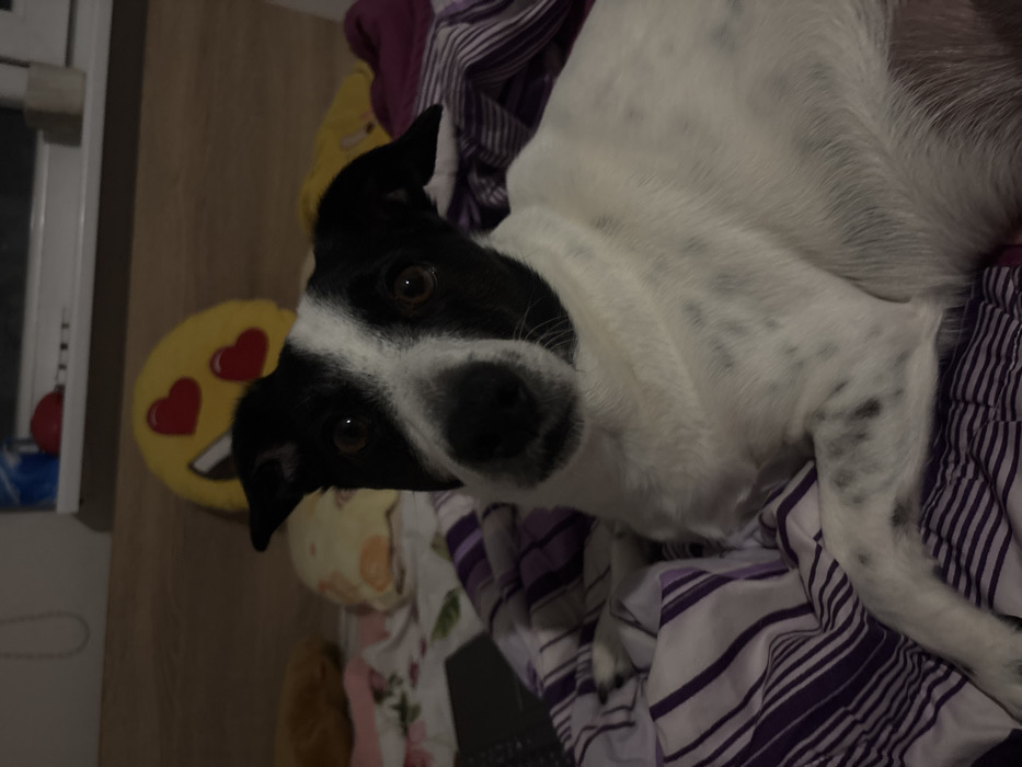 - "The image displays a black and white short-haired dog lying on a bed in an indoor residential setting, identified as the city of Haskovo, Bulgaria" by FM-xI8gl2, licensed under CC BY 4.0