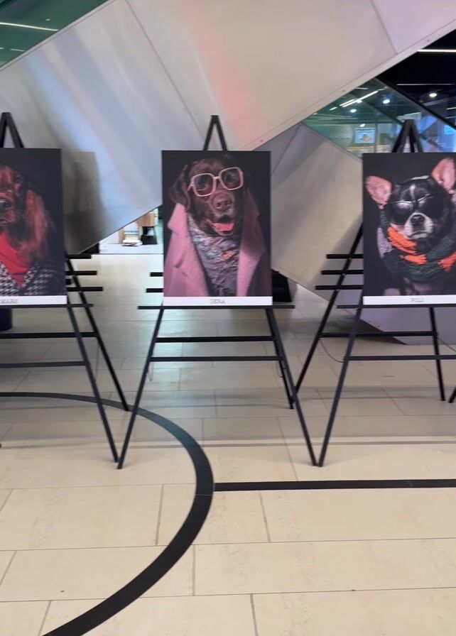 row of four framed photographs of dogs, each set on a black metal easel. The first dog is a reddish-brown dog wearing a black-and-white jacket and a red shirt. The second dog is a chocolate labrador wearing pink sunglasses and a pink coat. The third dog is a small black and white Chihuahua wearing a green, orange, and black scarf. The fourth dog is a reddish-brown dog wearing a red hat and scarf. The photographs are displayed in a modern interior space with white tiled floors marked with a curving black stripe. An escalator can be seen in the background. There are no people immediately visible in the foreground.
