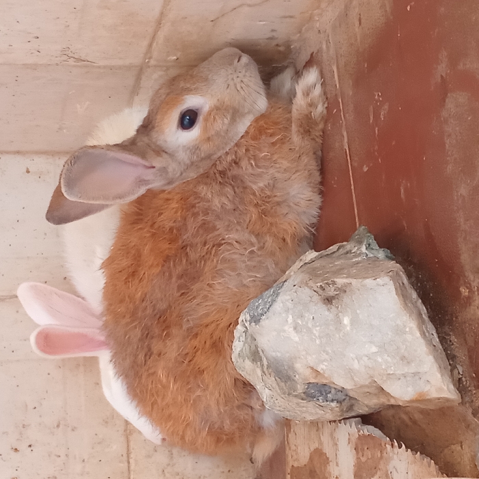 The scene depicts two rabbits within an enclosed structure in Sabon Tasha, Nigeria. A light reddish-brown rabbit, with dark eyes and upright ears, rests on a reddish-brown tiled floor in the foreground, oriented to the right. Behind it, partially visible, is a white rabbit, with only its distinct pink ears prominent. Adjacent to the brown rabbit, on the left, is a light-colored, irregularly shaped rock with visible grey and green mineral inclusions. The background comprises light beige-colored, textured walls forming an interior corner. Both the floor and wall surfaces exhibit minor staining and wear.