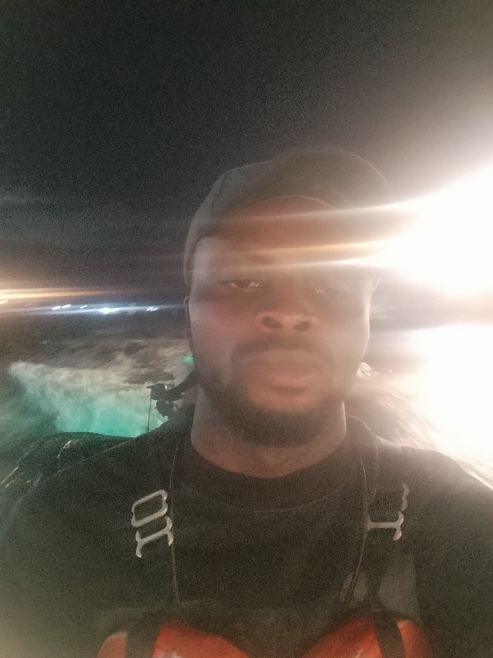 A man wearing a black baseball cap and black shirt takes a selfie at night. A harness with silver straps is visible on his chest. Behind him, blurred lights indicate an urban setting, possibly a waterfront. Bright light is overexposed on the right side. His facial hair is neatly trimmed. The background suggests he may be outdoors at a tourist attraction or event.