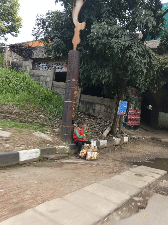 An elderly man in a red vest sits beside a curb, a collection of goods in front of him, likely for sale. He leans against a tall, rusty metal pole topped with a sculpture. Behind him, a concrete retaining wall with graffiti supports a grassy slope. Trees provide shade, and posters hang from one of them. The foreground shows a rough, paved road with a puddle, suggesting a street scene.