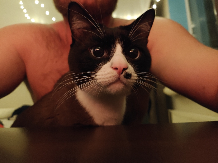A close-up shows a brown and white cat with large eyes. The cat is perched behind a dark brown surface. The cat has a white patch on its face and a spot on the right side of its nose. The background shows a person's bare chest and arms, with a string of lights above their shoulders. Part of a white object, possibly a piece of furniture, can be seen in the background to the right.
