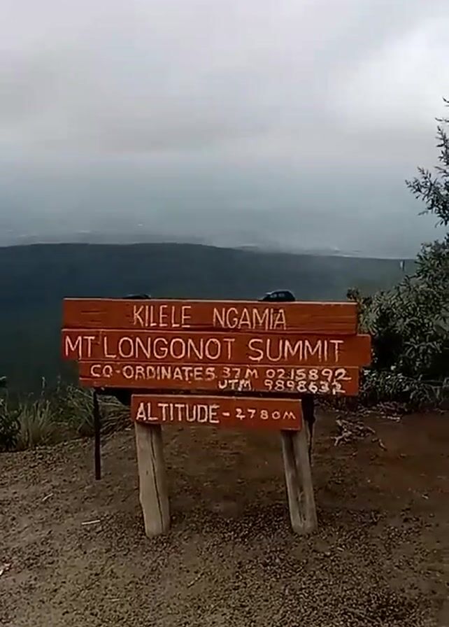 sign at the summit of Mt. Longonot. The sign reads "KILELE NGAMIA," "MT. LONGONOT SUMMIT," with coordinates listed as "CQ-ORDINATES: 37M 0215892 UTM: 9898632." The sign also states the altitude is "2780 M." The sign is made of wood and is supported by three wooden posts. The ground around the sign is rocky and gravelly. In the background, there is a view of the surrounding landscape under a cloudy sky. There is vegetation in the foreground to the left and the right of the sign.