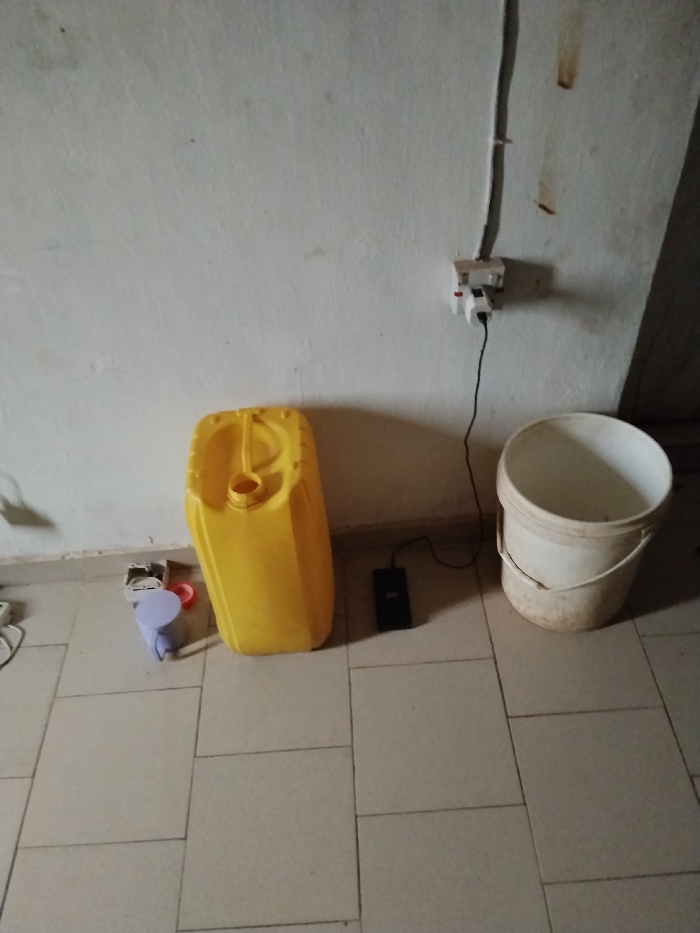 A yellow plastic jerrycan with a missing cap stands next to a white bucket on a tiled floor, against a white wall. A black charger connects to an electrical outlet on the wall. Near the jerrycan is a small purple and pink object, partially obscured. The scene appears to be indoors, possibly in a storage area or utility room.