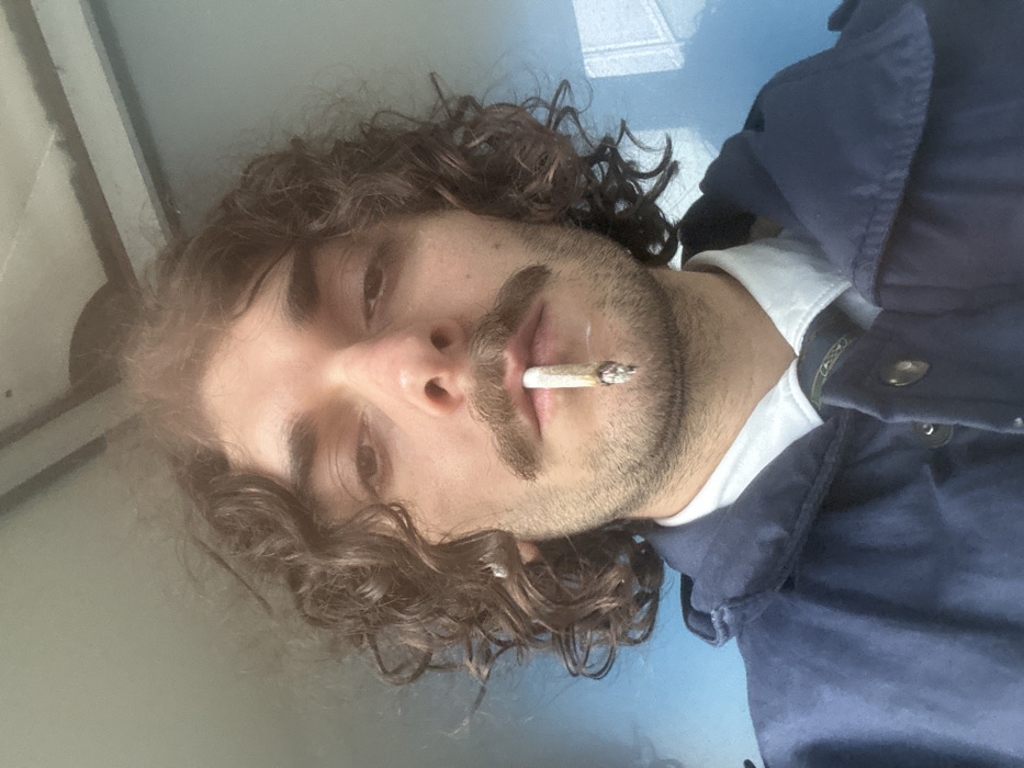 A close-up, eye-level portrait features a male individual with dark, curly, shoulder-length hair, a prominent moustache, and light stubble on his chin. He wears a white collared shirt, a patterned dark tie, and a dark blue jacket. A silver-colored stud earring is visible in his left ear. A lit, hand-rolled cigarette, exhibiting a small amount of ash, is positioned between his lips. The subject gazes directly forward with a neutral expression. The background consists of an indistinct, light blue-grey surface, indicative of an interior or enclosed setting, with faint reflections visible on the right. The scene is located in Chatou, France.