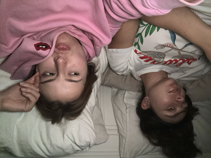 Two individuals are depicted lying in a bed in a dimly lit indoor environment. The specific location within Paris, France, cannot be determined from the visual information provided. On the left, an individual with dark hair splayed upwards on a white pillow lies on her back. She is wearing a white short-sleeved t-shirt featuring a graphic design with the word "always" and illustrations of crossed tennis rackets and green foliage. Her lips are slightly parted, and her gaze appears directed towards the viewer, though her eyes are not sharply focused. On the right, another individual, partially obscured, lies on her back or side, wearing a pink hooded sweatshirt. The hoodie features an embroidered design of red lips on the edge of the hood. Her right hand is raised near her face, with fingers touching her temple or hair, and her eyes are looking towards the right side of the frame. Her lips are slightly pursed. The bedding consists of white pillows and light-colored sheets, with a white headboard or wall panel visible in the background. The interaction is passive, with both subjects seemingly relaxed or resting.