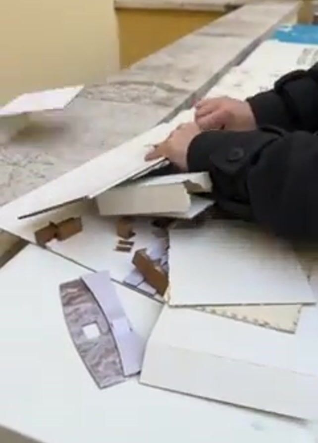 A person wearing a dark-colored jacket is tearing apart a cardboard model on a white surface. The model is made of white and brown cardboard pieces and includes what appears to be a small room, a bathtub, and furniture. The person is pulling the pieces apart with their hands. The location seems to be outdoors, near a building with yellow walls and window frames. The person then takes a stack of white cardboard pieces and walks away. The video cuts to a view looking down a flight of stairs. A white cardboard piece can be seen on the stairs. The video cuts back to the person, who is now indoors, continuing to dismantle the cardboard model on the white surface. Another person is visible in the background.