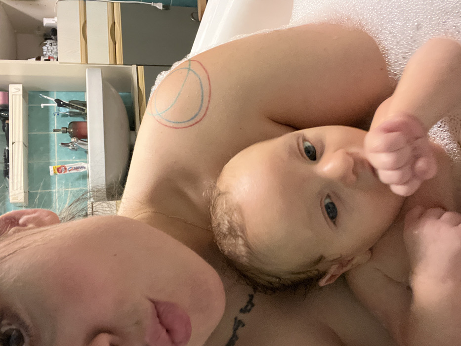 A person lies in a bathtub filled with bubbles, cradling a baby. The baby gazes directly at the camera with wide eyes. The person taking the selfie is partially visible, with their face close to the camera. A tattoo consisting of blue and red concentric circles is visible on the person's shoulder. Bathroom accessories, including a toothbrush and a cabinet, are visible in the background.