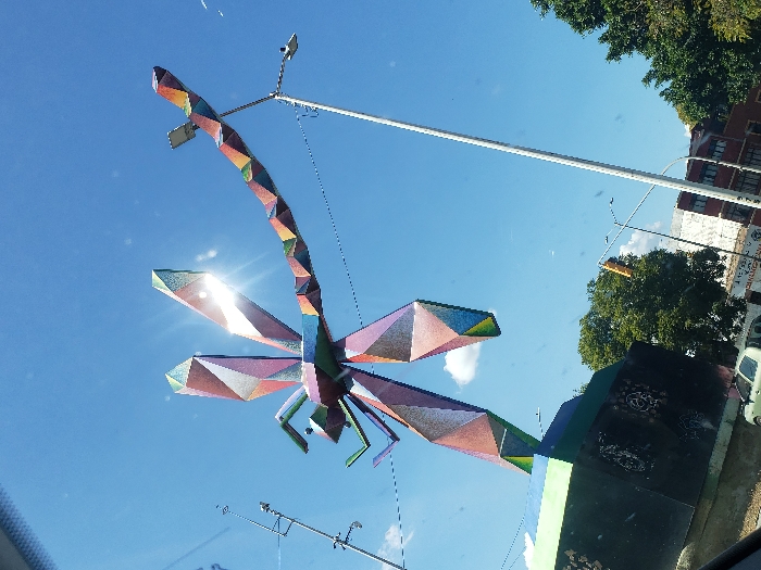 A low-angle shot reveals a large, colorful, geometric dragonfly sculpture mounted on a black and green pedestal