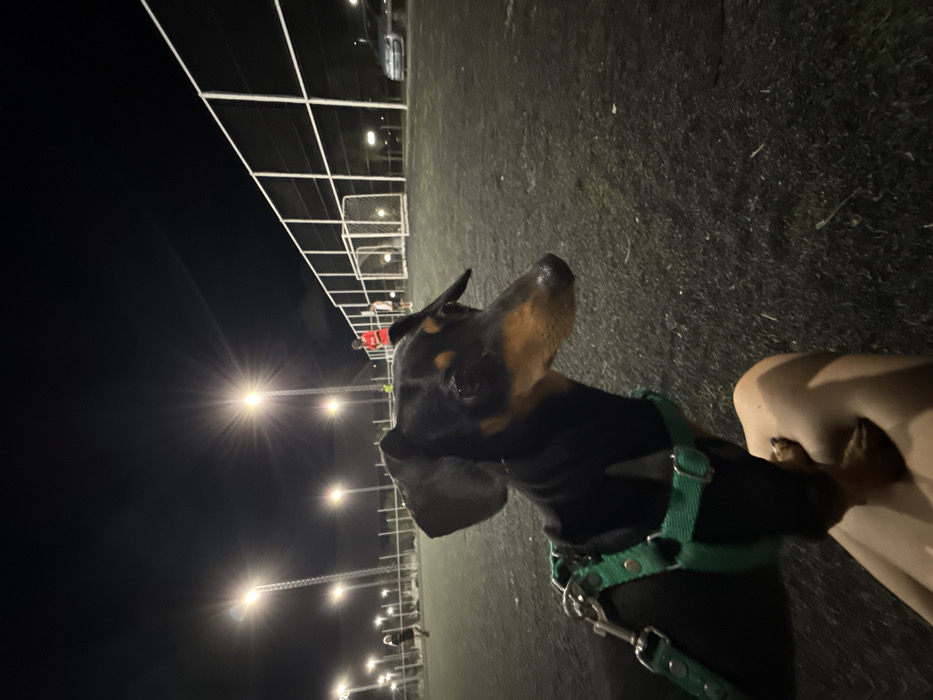 - "A black and tan dachshund, fitted with a green harness, stands in the immediate foreground at night, its right front paw resting on a person's bare leg" by FM-MfmqH2, licensed under CC BY 4.0