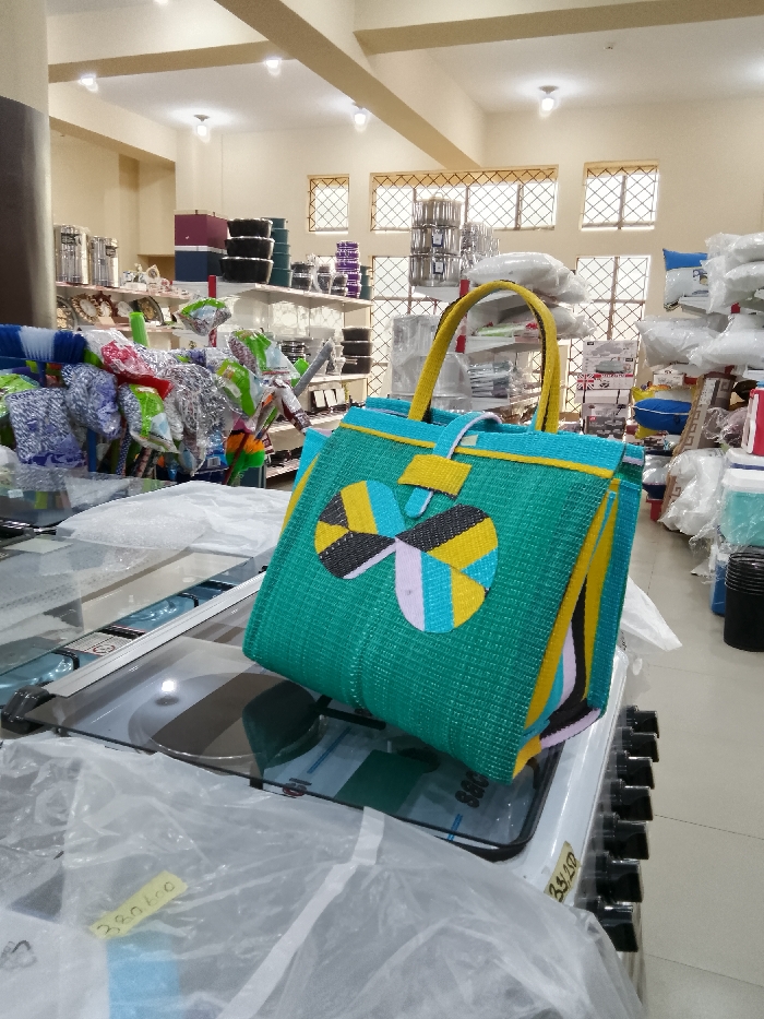 A teal-colored woven tote bag with yellow handles and a multi-segment circular appliqué in yellow, black, light blue, and pink/white is centered in the foreground, resting on a white gas cooker. The cooker is partially enveloped in transparent plastic sheeting, which bears a yellow handwritten label marked "380.00" in the lower left, and "35/20" on the cooker's control panel. The background depicts the interior of a retail store, presumably a homeware or kitchenware outlet, characterized by light beige walls and ceiling. Shelving units line the walls, displaying an array of merchandise, including stainless steel pots and pans, various dark-colored kitchen containers, and bundled cleaning implements such as brooms and mops, many still in plastic packaging. Recessed lighting fixtures are visible on the ceiling. Multiple rectangular windows, fitted with white security grilles, punctuate the back wall. This scene is located within a commercial establishment in Awka, Nigeria.
