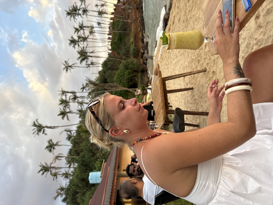 A blonde-haired Caucasian female, appearing to be in her late 20s to early 30s, is seated at a wooden table on a sandy beach in Thalaramba, Sri Lanka