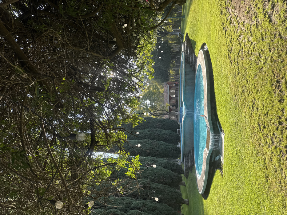 A lush green lawn extends to an oddly-shaped, blue swimming pool. A line of manicured bushes stands between the pool and a distant building. Bare tree branches with strung lights hang overhead, partially obscuring the view of the sky. The image has a serene, outdoor feel, capturing a well-maintained garden space.