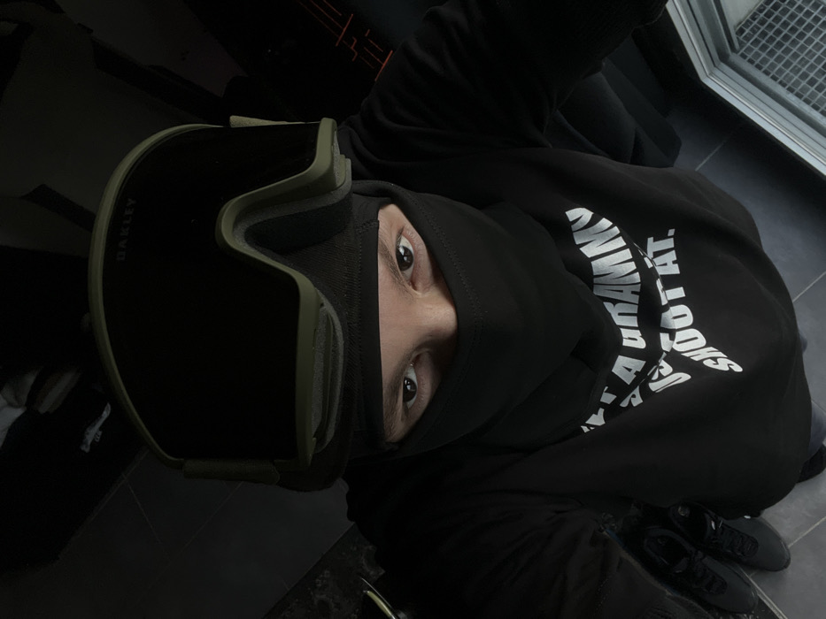 The image depicts a high-angle selfie of an individual in an indoor, dimly lit environment in Orsay, France. The subject's face is partially obscured by a black balaclava or neck gaiter covering the nose and mouth. Visible eyes feature dark irises and pupils. Olive green-framed Oakley-brand goggles, with a dark lens, are pushed up onto the individual's forehead. The subject wears a black long-sleeved shirt with white text on the chest, partially legible as "IEI.A URAN MY" and "SHOOT AT." The background reveals dark tiled flooring. To the left, a pair of dark athletic shoes are visible on the floor. To the lower right, a metal grate or vent is visible on the floor. The subject is looking directly at the camera.