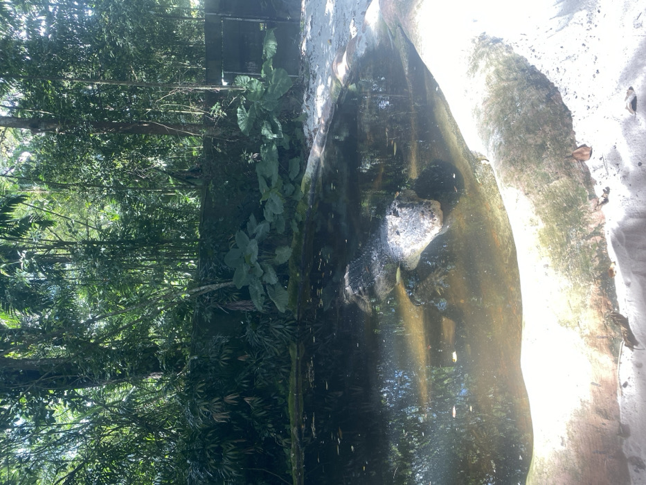 A body of water reflects the lush green foliage of a tropical forest. Tall bamboo stalks and broad-leafed plants line the water's edge, their reflections rippling on the dark surface. A large, pale, possibly man-made structure borders the water, its texture contrasting with the natural surroundings. Sunlight penetrates the canopy, creating shimmering highlights on the water and illuminating parts of the structure.