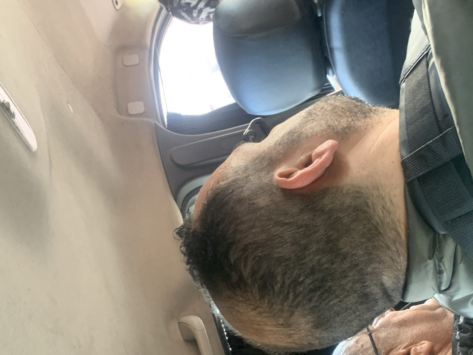The scene depicts the interior of a vehicle in Tangier, Morocco, during daylight hours. The primary subject is the back of a male's head, visible from the neck up, occupying the central frame. He has short, dark hair, with evident balding or thinning areas on the crown and sides, and a short, dark beard. He wears a dark garment, possibly a jacket, with a black strap from a bag or seatbelt visible over his right shoulder. His head is slightly tilted upwards and to the right, suggesting he is a passenger looking forward or slightly out a window. To the left and slightly behind the main subject, a partial view of another individual's head is visible, showing the back of their head, left ear, and light-colored hair, consistent with an elderly person wearing glasses. To the right of the main subject, a black headrest of a vehicle seat is prominent. The vehicle's interior features a beige headliner with an overhead light fixture towards the front and a grab handle on the left side. A bright exterior view, indicative of direct sunlight, is visible through a side window on the right, partially obscured by a patterned fabric from what appears to be another person or object. No explicit actions or interactions are occurring; the individuals appear to be in transit.
