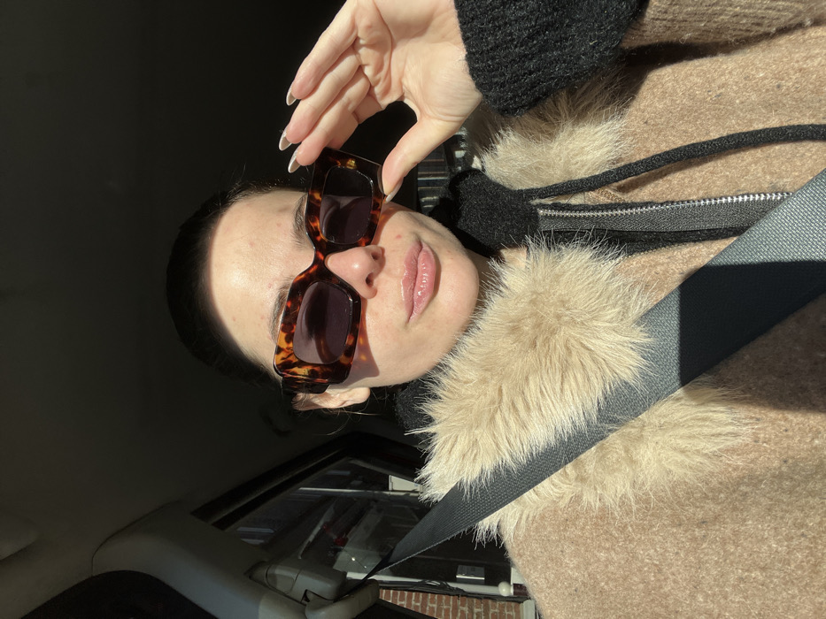 A female individual is seated in the front passenger seat of a vehicle, located in La Madeleine, France. She faces directly towards the camera, illuminated by strong sunlight from the left. She wears large, rectangular tortoiseshell sunglasses, which her left hand (viewer's right) is adjusting by holding the lower frame. Her lips are slightly parted and appear glossy. Her dark hair is pulled back. She is dressed in a light brown or camel-colored coat featuring a prominent light beige faux fur trim around the neckline, layered over a dark, possibly black, hooded garment with a visible zipper. A dark gray seatbelt is fastened across her chest and shoulder. Through the vehicle's window on the left, a brick building and a portion of a street scene are visible under bright daylight.