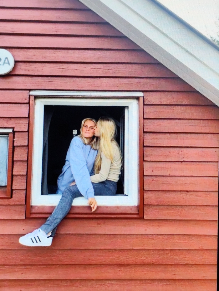 Two young adult blonde females are depicted in a white-framed window set into a reddish-brown wooden-sided building in Otta, Norway