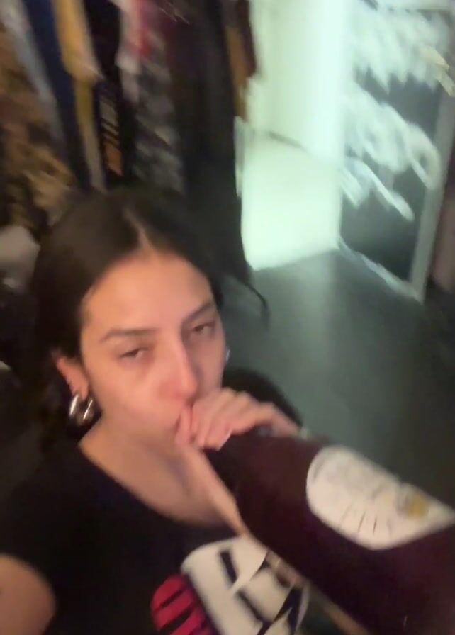 A woman with dark hair tied back in a ponytail and wearing silver hoop earrings drinks from a large brown bottle with a white label. She's wearing a black t-shirt with a white and red design. The camera moves, showing different backgrounds: a closet with hanging clothes, a desk with a chair, a table, and a wall covered with posters and decorations. The scene appears to be inside an apartment. The music plays loudly in the background.