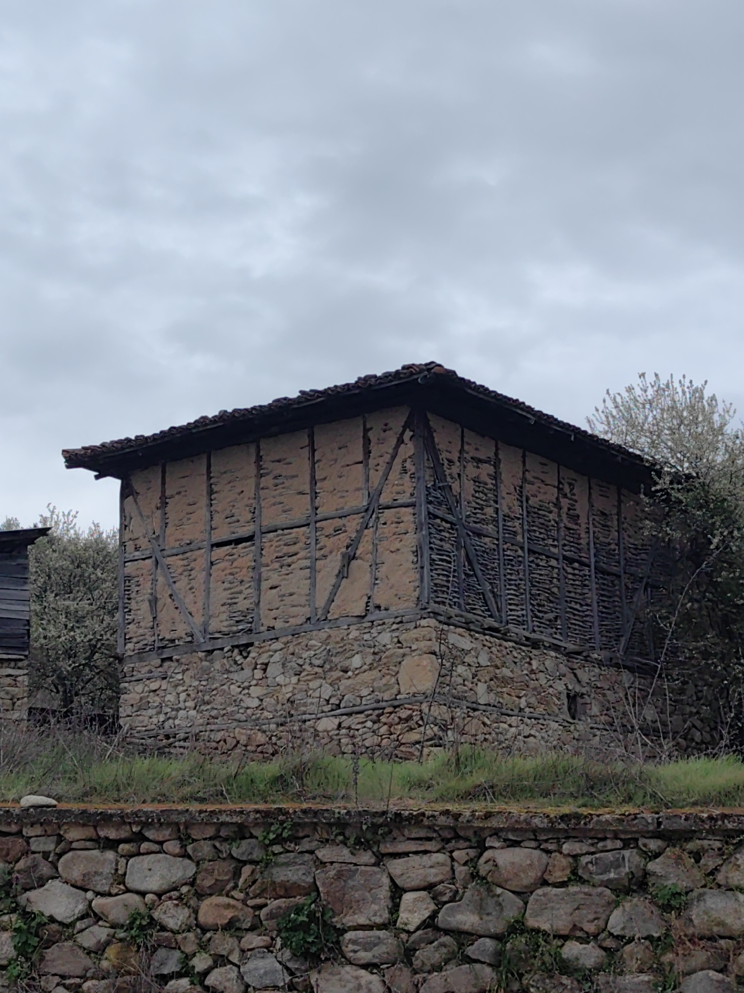 n old, two-story building in what appears to be a rural setting. The building's first story is constructed from large, irregular stones. The second story features a half-timbered design with wooden beams framing sections filled with mud or clay. The roof is tiled and slightly overhanging. In front of the building is a stone wall, likely part of a property boundary or retaining wall. The sky is overcast. There is sparse vegetation in the foreground, with a bush/tree with white blossoms visible to the right. The location is Slatina, Bulgaria.