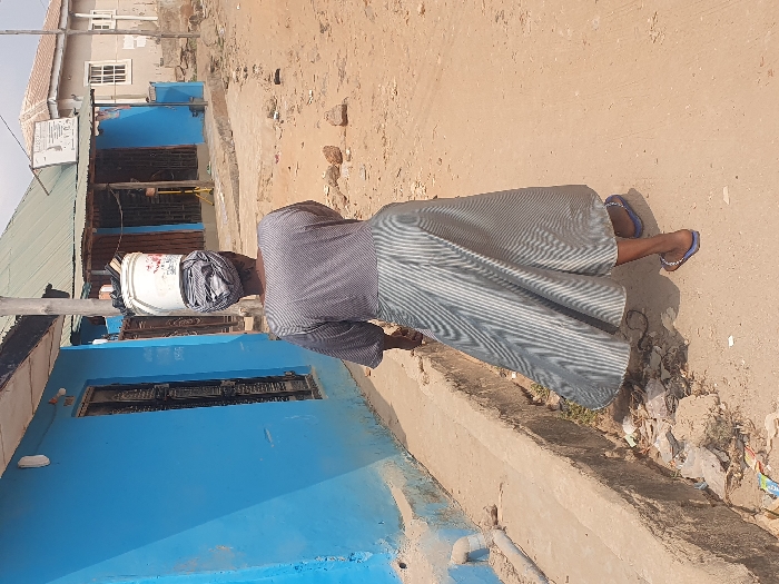 The scene depicts an outdoor environment in Burwood, Australia, under daylight conditions. An individual, viewed from behind, is walking forward on an unpaved, light brown dirt path. The person is wearing a grey short-sleeved top, a long grey skirt with diagonal white stripes, and blue flip-flops. A white plastic bucket, containing dark materials and marked with some red details, is balanced on their head, secured by a grey fabric headwrap. To the immediate left of the path, a raised concrete curb runs alongside a bright blue building with a dark-colored security door. Accumulations of litter, including plastic bags and debris, are visible in the gutter area between the path and the building's base. Further along the left, a second blue building with a green corrugated metal roof and a light-colored sign is present. A vertical wooden pole stands between these structures. In the background, on the right side, another building with a light-colored exterior and a tiled roof is visible. The sky above is overcast or hazy.