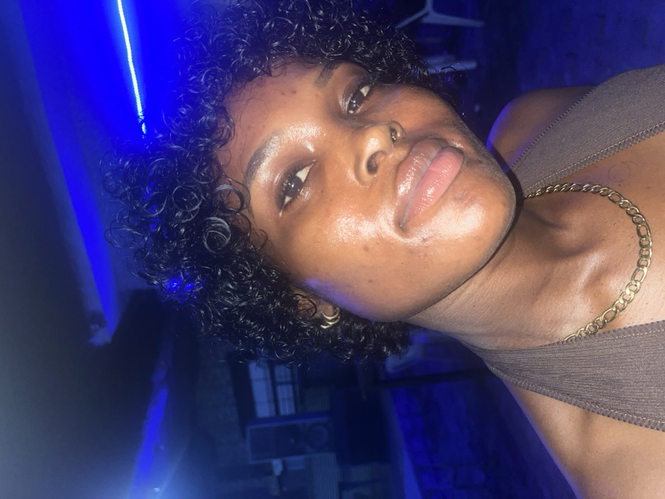 A young woman poses with her face tilted upwards, showcasing a nose ring and curly, dark hair. She wears a brown top and a gold necklace. A blue light casts shadows across her face and shoulder. An air conditioning unit is visible in the background.