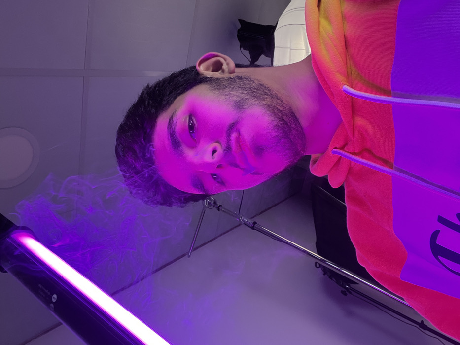 A person's face, illuminated with purple light, fills the frame. He has short dark hair, a beard, and is wearing an orange hoodie. In the foreground, a purple light tube emits smoke. A supporting pole is visible, angled behind his face. The background is a dimly lit room with a circular light fixture on the ceiling. The image is slightly rotated.