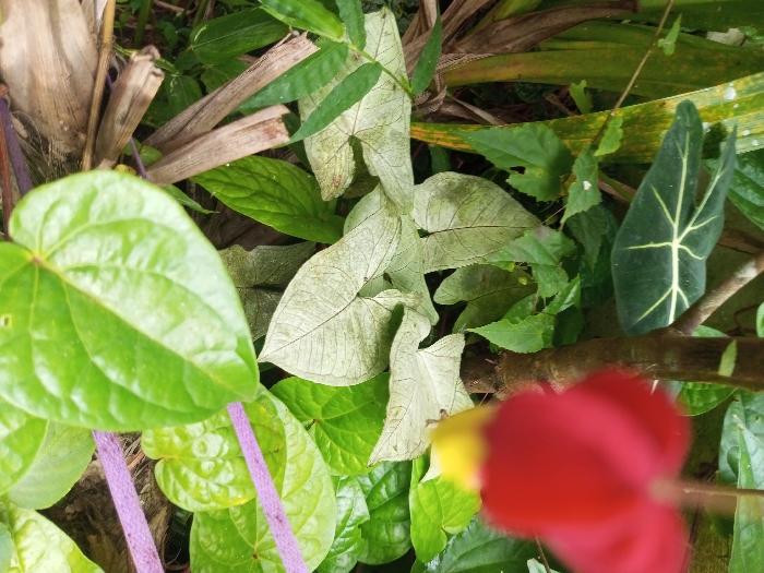 The scene captures a close-up view of dense plant foliage and stems in Bhendala, India. The foreground is dominated by large, vibrant green, heart-shaped leaves, beneath which two thin, parallel purple stalks are visible. To the upper left, dried, fibrous brown plant material is present. Centrally, several pale green to whitish leaves with intricate venation are clustered. A dark green, arrow-shaped leaf with prominent white veins is situated in the mid-right. A brown woody branch extends horizontally across the right mid-ground. The lower right corner features a heavily blurred, out-of-focus object, primarily red with a yellow tip, consistent with a flower. The environment is characterized by lush, mixed vegetation with no individuals or active subjects present.