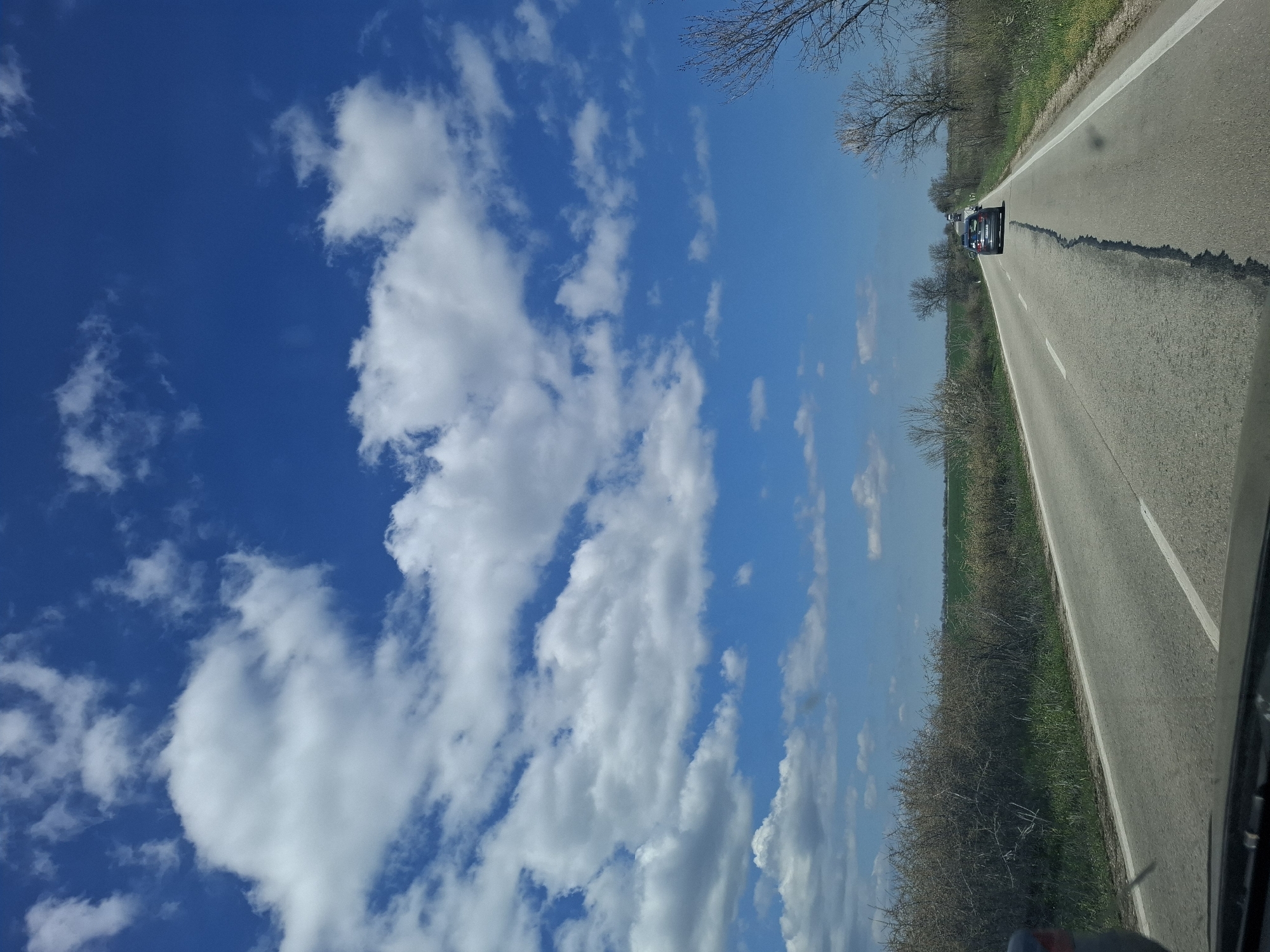 The image depicts a road in Topolovets, Bulgaria, on a clear day with scattered white clouds in a blue sky. Two cars are visible on the road. Vegetation borders the road. The photograph was likely taken from inside a vehicle.